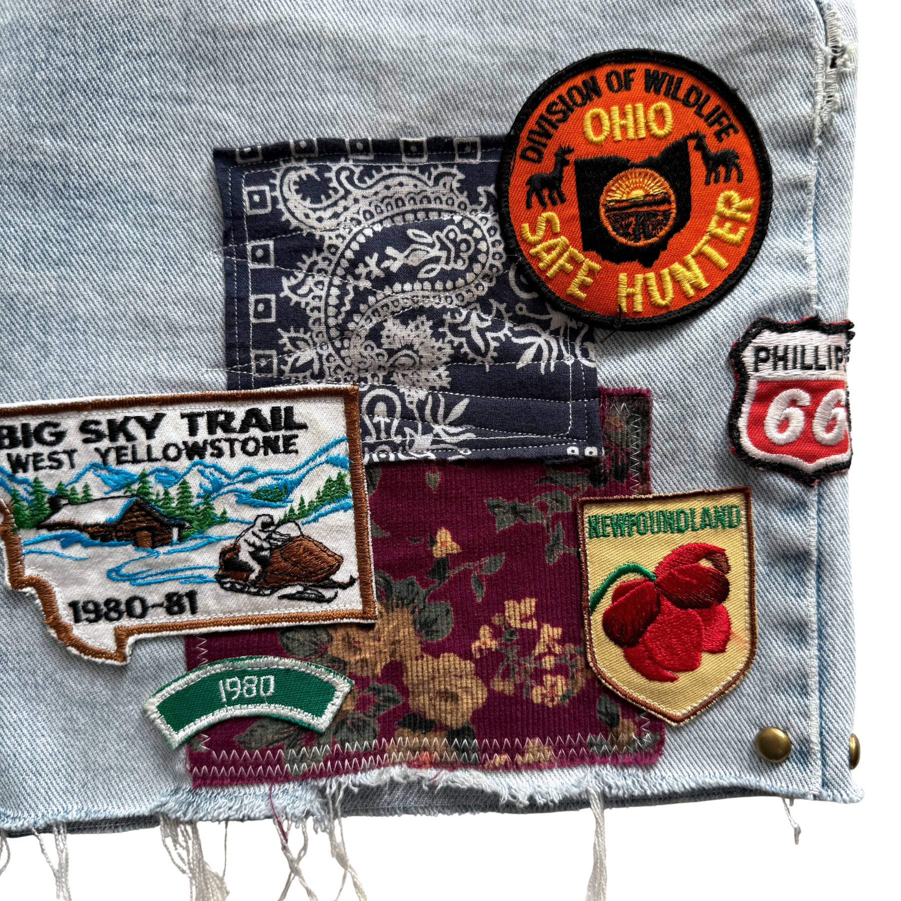 Features custom scout patches, scrap fabric patches, and more cool threads, studded details on the outseam, large chenille patch on the back right leg, and overall just fun details. All was done by myself and worn only a couple times. The two rivets near the left pocket can be used to attach keys. Great fading in the denim and overall distressed look. See photos.